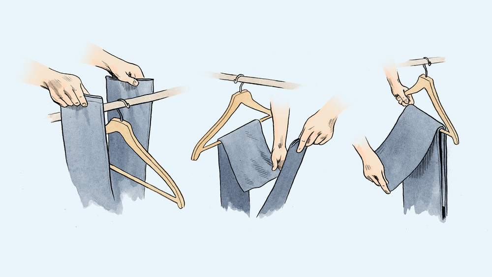 The most annoying thing about storing trousers, whether in your closet at home or in a hotel room is they tend to slide off their hanger. There is a nice trick of the trade. They call it ‘The Savile Row Fold’ because Savile Row employees, who were tired of picking up trousers from hangers all day, invented the method. Hold onto the bottom of each leg of your trousers with one hand. Take the hanger in your other hand. Fold one leg with the inside leg down through the hanger so the hem nearly touches the crotch. Take the other leg, and neatly fold it over in the same way. It will help your suit to stay in shape.